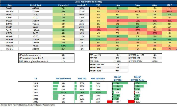 Deniz Yatırım Model Portföy, Deniz Yatırım Strateji ve Araştırma Bölümü tarafından, temel analiz kriterlerine göre hazırlanmış, orta-uzun vadeli hisse senedi tavsiye listesidir. Alınan pozisyonlar sadece uzun yönlüdür (long only). Herhangi bir rakamsal/yüzdesel getiri hedefi söz konusu değildir. Herhangi bir şirket sayısı sınırı söz konusu değildir. Herhangi bir sıklıkta/takvim dahilinde değişiklik yapma zorunluluğu söz konusu değildir. Strateji ve Araştırma Bölümü analistleri portföyü takvim yılı içerisinde piyasa koşulları izin vermez ise değiştirmeme hakkına sahiptirler. Portföy içerisinde yer alan şirketler için temel analiz açısından getiri potansiyeli kalmamış dahi olsa da (değerleme olarak) şirket markasına olan geçmiş ve gelecek dönem güveni ile liste içerisinde kalmaya devam edebilirler. Portföyde yer alan şirketler için AL tavsiyesi bulunması zorunluluğu söz konusu değildir. Bölüm analistleri, TUT ve/veya Gözden Geçiriliyor önerileri ile de liste içerisinde şirket tercihinde bulunabilirler.