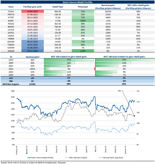 Deniz Yatırım Model Portföy, Deniz Yatırım Strateji ve Araştırma Bölümü tarafından, temel analiz kriterlerine göre hazırlanmış, orta-uzun vadeli hisse senedi tavsiye listesidir. Alınan pozisyonlar sadece uzun yönlüdür (long only). Herhangi bir rakamsal/yüzdesel getiri hedefi söz konusu değildir. Herhangi bir şirket sayısı sınırı söz konusu değildir. Herhangi bir sıklıkta/takvim dahilinde değişiklik yapma zorunluluğu söz konusu değildir. Strateji ve Araştırma Bölümü analistleri portföyü takvim yılı içerisinde piyasa koşulları izin vermez ise değiştirmeme hakkına sahiptirler. Portföy içerisinde yer alan şirketler için temel analiz açısından getiri potansiyeli kalmamış dahi olsa da (değerleme olarak) şirket markasına olan geçmiş ve gelecek dönem güveni ile liste içerisinde kalmaya devam edebilirler. Portföyde yer alan şirketler için AL tavsiyesi bulunması zorunluluğu söz konusu değildir. Bölüm analistleri, TUT ve/veya Gözden Geçiriliyor önerileri ile de liste içerisinde şirket tercihinde bulunabilirler.