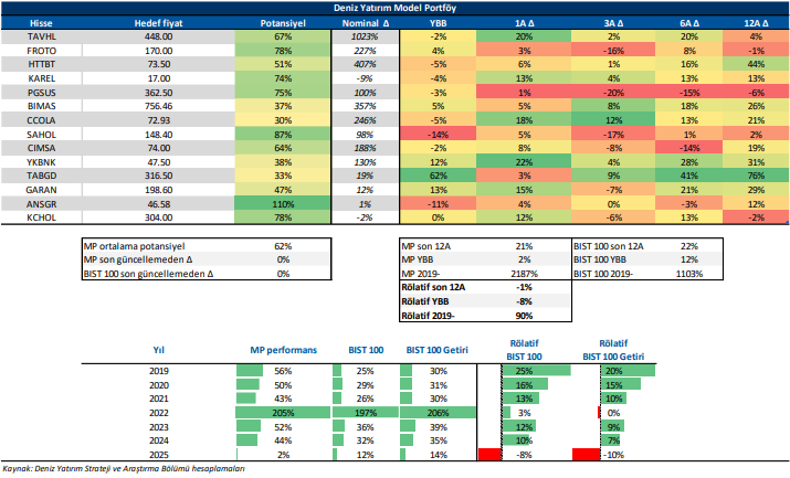 Deniz Yatırım Model Portföy, Deniz Yatırım Strateji ve Araştırma Bölümü tarafından, temel analiz kriterlerine göre hazırlanmış, orta-uzun vadeli hisse senedi tavsiye listesidir. Alınan pozisyonlar sadece uzun yönlüdür (long only). Herhangi bir rakamsal/yüzdesel getiri hedefi söz konusu değildir. Herhangi bir şirket sayısı sınırı söz konusu değildir. Herhangi bir sıklıkta/takvim dahilinde değişiklik yapma zorunluluğu söz konusu değildir. Strateji ve Araştırma Bölümü analistleri portföyü takvim yılı içerisinde piyasa koşulları izin vermez ise değiştirmeme hakkına sahiptirler. Portföy içerisinde yer alan şirketler için temel analiz açısından getiri potansiyeli kalmamış dahi olsa da (değerleme olarak) şirket markasına olan geçmiş ve gelecek dönem güveni ile liste içerisinde kalmaya devam edebilirler. Portföyde yer alan şirketler için AL tavsiyesi bulunması zorunluluğu söz konusu değildir. Bölüm analistleri, TUT ve/veya Gözden Geçiriliyor önerileri ile de liste içerisinde şirket tercihinde bulunabilirler.