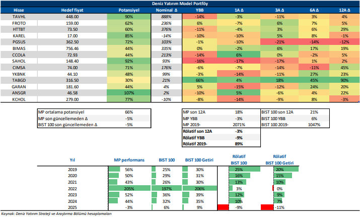 Deniz Yatırım Model Portföy, Deniz Yatırım Strateji ve Araştırma Bölümü tarafından, temel analiz kriterlerine göre hazırlanmış, orta-uzun vadeli hisse senedi tavsiye listesidir. Alınan pozisyonlar sadece uzun yönlüdür (long only). Herhangi bir rakamsal/yüzdesel getiri hedefi söz konusu değildir. Herhangi bir şirket sayısı sınırı söz konusu değildir. Herhangi bir sıklıkta/takvim dahilinde değişiklik yapma zorunluluğu söz konusu değildir. Strateji ve Araştırma Bölümü analistleri portföyü takvim yılı içerisinde piyasa koşulları izin vermez ise değiştirmeme hakkına sahiptirler. Portföy içerisinde yer alan şirketler için temel analiz açısından getiri potansiyeli kalmamış dahi olsa da (değerleme olarak) şirket markasına olan geçmiş ve gelecek dönem güveni ile liste içerisinde kalmaya devam edebilirler. Portföyde yer alan şirketler için AL tavsiyesi bulunması zorunluluğu söz konusu değildir. Bölüm analistleri, TUT ve/veya Gözden Geçiriliyor önerileri ile de liste içerisinde şirket tercihinde bulunabilirler.