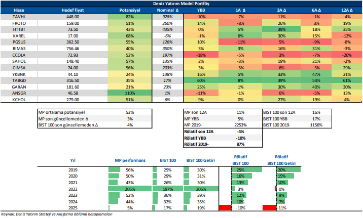 Deniz Yatırım Model Portföy, Deniz Yatırım Strateji ve Araştırma Bölümü tarafından, temel analiz kriterlerine göre hazırlanmış, orta-uzun vadeli hisse senedi tavsiye listesidir. Alınan pozisyonlar sadece uzun yönlüdür (long only). Herhangi bir rakamsal/yüzdesel getiri hedefi söz konusu değildir. Herhangi bir şirket sayısı sınırı söz konusu değildir. Herhangi bir sıklıkta/takvim dahilinde değişiklik yapma zorunluluğu söz konusu değildir. Strateji ve Araştırma Bölümü analistleri portföyü takvim yılı içerisinde piyasa koşulları izin vermez ise değiştirmeme hakkına sahiptirler. Portföy içerisinde yer alan şirketler için temel analiz açısından getiri potansiyeli kalmamış dahi olsa da (değerleme olarak) şirket markasına olan geçmiş ve gelecek dönem güveni ile liste içerisinde kalmaya devam edebilirler. Portföyde yer alan şirketler için AL tavsiyesi bulunması zorunluluğu söz konusu değildir. Bölüm analistleri, TUT ve/veya Gözden Geçiriliyor önerileri ile de liste içerisinde şirket tercihinde bulunabilirler.