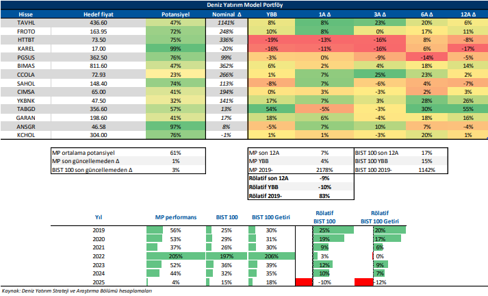 Deniz Yatırım Model Portföy, Deniz Yatırım Strateji ve Araştırma Bölümü tarafından, temel analiz kriterlerine göre hazırlanmış, orta-uzun vadeli hisse senedi tavsiye listesidir. Alınan pozisyonlar sadece uzun yönlüdür (long only). Herhangi bir rakamsal/yüzdesel getiri hedefi söz konusu değildir. Herhangi bir şirket sayısı sınırı söz konusu değildir. Herhangi bir sıklıkta/takvim dahilinde değişiklik yapma zorunluluğu söz konusu değildir. Strateji ve Araştırma Bölümü analistleri portföyü takvim yılı içerisinde piyasa koşulları izin vermez ise değiştirmeme hakkına sahiptirler. Portföy içerisinde yer alan şirketler için temel analiz açısından getiri potansiyeli kalmamış dahi olsa da (değerleme olarak) şirket markasına olan geçmiş ve gelecek dönem güveni ile liste içerisinde kalmaya devam edebilirler. Portföyde yer alan şirketler için AL tavsiyesi bulunması zorunluluğu söz konusu değildir. Bölüm analistleri, TUT ve/veya Gözden Geçiriliyor önerileri ile de liste içerisinde şirket tercihinde bulunabilirler.