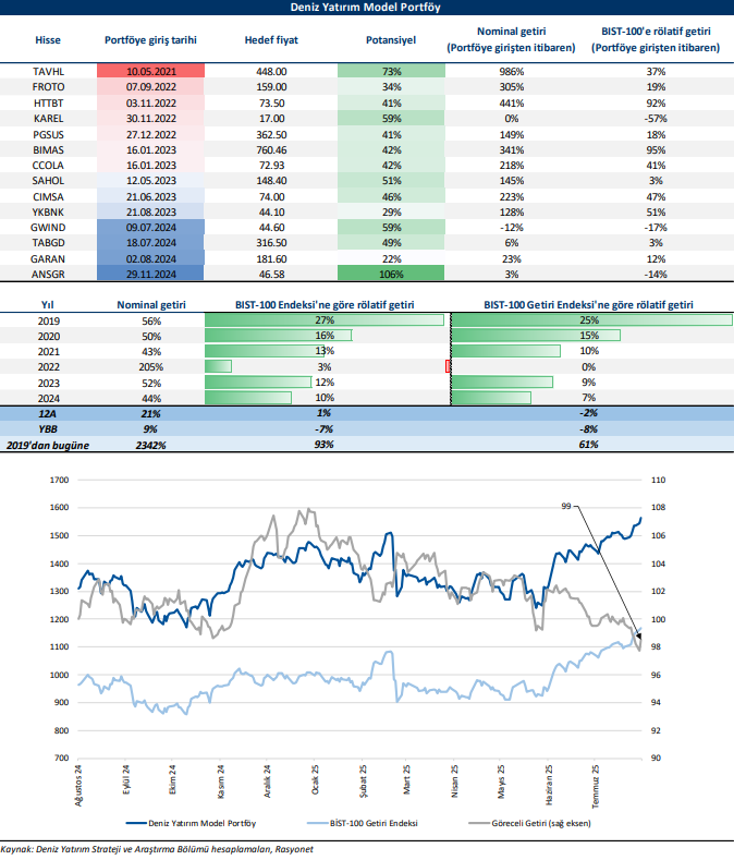 Deniz Yatırım Model Portföy, Deniz Yatırım Strateji ve Araştırma Bölümü tarafından, temel analiz kriterlerine göre hazırlanmış, orta-uzun vadeli hisse senedi tavsiye listesidir. Alınan pozisyonlar sadece uzun yönlüdür (long only). Herhangi bir rakamsal/yüzdesel getiri hedefi söz konusu değildir. Herhangi bir şirket sayısı sınırı söz konusu değildir. Herhangi bir sıklıkta/takvim dahilinde değişiklik yapma zorunluluğu söz konusu değildir. Strateji ve Araştırma Bölümü analistleri portföyü takvim yılı içerisinde piyasa koşulları izin vermez ise değiştirmeme hakkına sahiptirler. Portföy içerisinde yer alan şirketler için temel analiz açısından getiri potansiyeli kalmamış dahi olsa da (değerleme olarak) şirket markasına olan geçmiş ve gelecek dönem güveni ile liste içerisinde kalmaya devam edebilirler. Portföyde yer alan şirketler için AL tavsiyesi bulunması zorunluluğu söz konusu değildir. Bölüm analistleri, TUT ve/veya Gözden Geçiriliyor önerileri ile de liste içerisinde şirket tercihinde bulunabilirler.