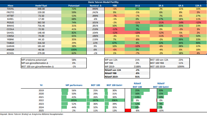 Deniz Yatırım Model Portföy, Deniz Yatırım Strateji ve Araştırma Bölümü tarafından, temel analiz kriterlerine göre hazırlanmış, orta-uzun vadeli hisse senedi tavsiye listesidir. Alınan pozisyonlar sadece uzun yönlüdür (long only). Herhangi bir rakamsal/yüzdesel getiri hedefi söz konusu değildir. Herhangi bir şirket sayısı sınırı söz konusu değildir. Herhangi bir sıklıkta/takvim dahilinde değişiklik yapma zorunluluğu söz konusu değildir. Strateji ve Araştırma Bölümü analistleri portföyü takvim yılı içerisinde piyasa koşulları izin vermez ise değiştirmeme hakkına sahiptirler. Portföy içerisinde yer alan şirketler için temel analiz açısından getiri potansiyeli kalmamış dahi olsa da (değerleme olarak) şirket markasına olan geçmiş ve gelecek dönem güveni ile liste içerisinde kalmaya devam edebilirler. Portföyde yer alan şirketler için AL tavsiyesi bulunması zorunluluğu söz konusu değildir. Bölüm analistleri, TUT ve/veya Gözden Geçiriliyor önerileri ile de liste içerisinde şirket tercihinde bulunabilirler.