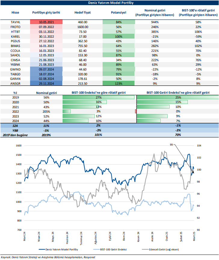 Deniz Yatırım Model Portföy, Deniz Yatırım Strateji ve Araştırma Bölümü tarafından, temel analiz kriterlerine göre hazırlanmış, orta-uzun vadeli hisse senedi tavsiye listesidir. Alınan pozisyonlar sadece uzun yönlüdür (long only). Herhangi bir rakamsal/yüzdesel getiri hedefi söz konusu değildir. Herhangi bir şirket sayısı sınırı söz konusu değildir. Herhangi bir sıklıkta/takvim dahilinde değişiklik yapma zorunluluğu söz konusu değildir. Strateji ve Araştırma Bölümü analistleri portföyü takvim yılı içerisinde piyasa koşulları izin vermez ise değiştirmeme hakkına sahiptirler. Portföy içerisinde yer alan şirketler için temel analiz açısından getiri potansiyeli kalmamış dahi olsa da (değerleme olarak) şirket markasına olan geçmiş ve gelecek dönem güveni ile liste içerisinde kalmaya devam edebilirler. Portföyde yer alan şirketler için AL tavsiyesi bulunması zorunluluğu söz konusu değildir. Bölüm analistleri, TUT ve/veya Gözden Geçiriliyor önerileri ile de liste içerisinde şirket tercihinde bulunabilirler.