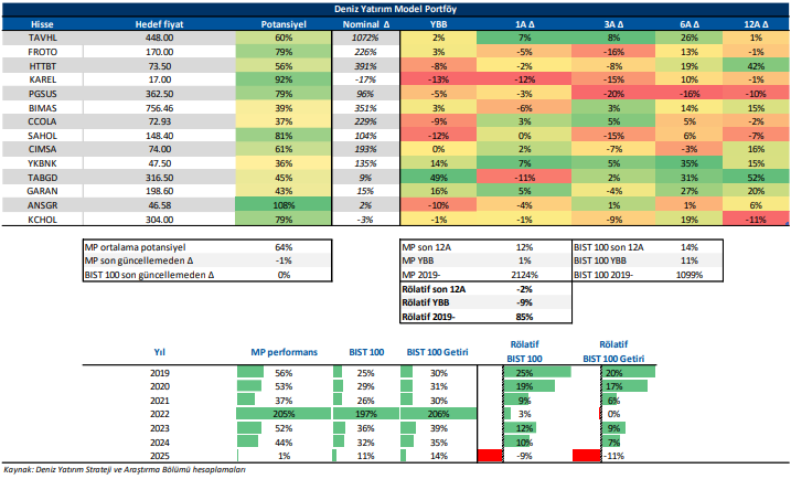 Deniz Yatırım Model Portföy, Deniz Yatırım Strateji ve Araştırma Bölümü tarafından, temel analiz kriterlerine göre hazırlanmış, orta-uzun vadeli hisse senedi tavsiye listesidir. Alınan pozisyonlar sadece uzun yönlüdür (long only). Herhangi bir rakamsal/yüzdesel getiri hedefi söz konusu değildir. Herhangi bir şirket sayısı sınırı söz konusu değildir. Herhangi bir sıklıkta/takvim dahilinde değişiklik yapma zorunluluğu söz konusu değildir. Strateji ve Araştırma Bölümü analistleri portföyü takvim yılı içerisinde piyasa koşulları izin vermez ise değiştirmeme hakkına sahiptirler. Portföy içerisinde yer alan şirketler için temel analiz açısından getiri potansiyeli kalmamış dahi olsa da (değerleme olarak) şirket markasına olan geçmiş ve gelecek dönem güveni ile liste içerisinde kalmaya devam edebilirler. Portföyde yer alan şirketler için AL tavsiyesi bulunması zorunluluğu söz konusu değildir. Bölüm analistleri, TUT ve/veya Gözden Geçiriliyor önerileri ile de liste içerisinde şirket tercihinde bulunabilirler.