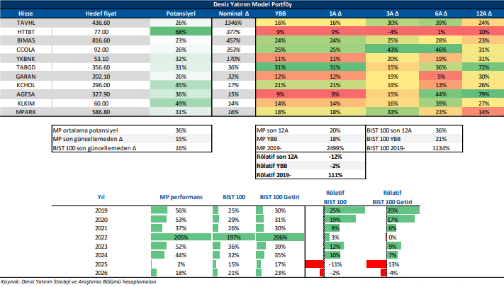 Deniz Yatırım Model Portföy, Deniz Yatırım Strateji ve Araştırma Bölümü tarafından, temel analiz kriterlerine göre hazırlanmış, orta-uzun vadeli hisse senedi tavsiye listesidir. Alınan pozisyonlar sadece uzun yönlüdür (long only). Herhangi bir rakamsal/yüzdesel getiri hedefi söz konusu değildir. Herhangi bir şirket sayısı sınırı söz konusu değildir. Herhangi bir sıklıkta/takvim dahilinde değişiklik yapma zorunluluğu söz konusu değildir. Strateji ve Araştırma Bölümü analistleri portföyü takvim yılı içerisinde piyasa koşulları izin vermez ise değiştirmeme hakkına sahiptirler. Portföy içerisinde yer alan şirketler için temel analiz açısından getiri potansiyeli kalmamış dahi olsa da (değerleme olarak) şirket markasına olan geçmiş ve gelecek dönem güveni ile liste içerisinde kalmaya devam edebilirler. Portföyde yer alan şirketler için AL tavsiyesi bulunması zorunluluğu söz konusu değildir. Bölüm analistleri, TUT ve/veya Gözden Geçiriliyor önerileri ile de liste içerisinde şirket tercihinde bulunabilirler.