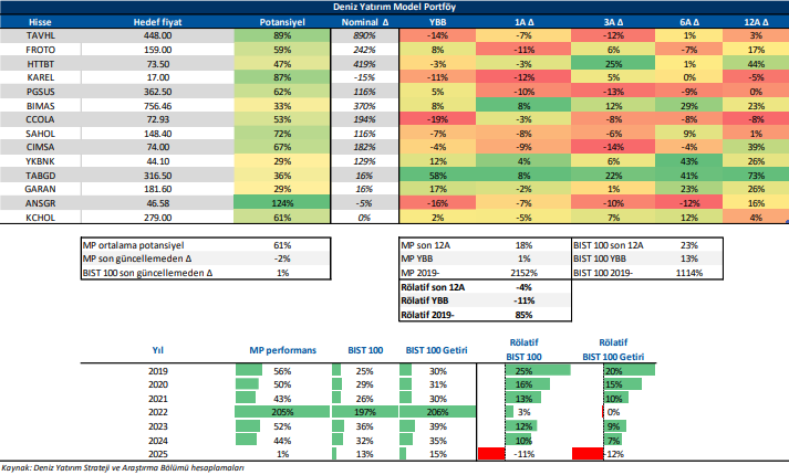 Deniz Yatırım Model Portföy, Deniz Yatırım Strateji ve Araştırma Bölümü tarafından, temel analiz kriterlerine göre hazırlanmış, orta-uzun vadeli hisse senedi tavsiye listesidir. Alınan pozisyonlar sadece uzun yönlüdür (long only). Herhangi bir rakamsal/yüzdesel getiri hedefi söz konusu değildir. Herhangi bir şirket sayısı sınırı söz konusu değildir. Herhangi bir sıklıkta/takvim dahilinde değişiklik yapma zorunluluğu söz konusu değildir. Strateji ve Araştırma Bölümü analistleri portföyü takvim yılı içerisinde piyasa koşulları izin vermez ise değiştirmeme hakkına sahiptirler. Portföy içerisinde yer alan şirketler için temel analiz açısından getiri potansiyeli kalmamış dahi olsa da (değerleme olarak) şirket markasına olan geçmiş ve gelecek dönem güveni ile liste içerisinde kalmaya devam edebilirler. Portföyde yer alan şirketler için AL tavsiyesi bulunması zorunluluğu söz konusu değildir. Bölüm analistleri, TUT ve/veya Gözden Geçiriliyor önerileri ile de liste içerisinde şirket tercihinde bulunabilirler.