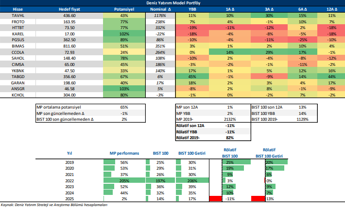 Deniz Yatırım Model Portföy, Deniz Yatırım Strateji ve Araştırma Bölümü tarafından, temel analiz kriterlerine göre hazırlanmış, orta-uzun vadeli hisse senedi tavsiye listesidir. Alınan pozisyonlar sadece uzun yönlüdür (long only). Herhangi bir rakamsal/yüzdesel getiri hedefi söz konusu değildir. Herhangi bir şirket sayısı sınırı söz konusu değildir. Herhangi bir sıklıkta/takvim dahilinde değişiklik yapma zorunluluğu söz konusu değildir. Strateji ve Araştırma Bölümü analistleri portföyü takvim yılı içerisinde piyasa koşulları izin vermez ise değiştirmeme hakkına sahiptirler. Portföy içerisinde yer alan şirketler için temel analiz açısından getiri potansiyeli kalmamış dahi olsa da (değerleme olarak) şirket markasına olan geçmiş ve gelecek dönem güveni ile liste içerisinde kalmaya devam edebilirler. Portföyde yer alan şirketler için AL tavsiyesi bulunması zorunluluğu söz konusu değildir. Bölüm analistleri, TUT ve/veya Gözden Geçiriliyor önerileri ile de liste içerisinde şirket tercihinde bulunabilirler.