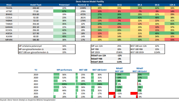 Deniz Yatırım Model Portföy, Deniz Yatırım Strateji ve Araştırma Bölümü tarafından, temel analiz kriterlerine göre hazırlanmış, orta-uzun vadeli hisse senedi tavsiye listesidir. Alınan pozisyonlar sadece uzun yönlüdür (long only). Herhangi bir rakamsal/yüzdesel getiri hedefi söz konusu değildir. Herhangi bir şirket sayısı sınırı söz konusu değildir. Herhangi bir sıklıkta/takvim dahilinde değişiklik yapma zorunluluğu söz konusu değildir. Strateji ve Araştırma Bölümü analistleri portföyü takvim yılı içerisinde piyasa koşulları izin vermez ise değiştirmeme hakkına sahiptirler. Portföy içerisinde yer alan şirketler için temel analiz açısından getiri potansiyeli kalmamış dahi olsa da (değerleme olarak) şirket markasına olan geçmiş ve gelecek dönem güveni ile liste içerisinde kalmaya devam edebilirler. Portföyde yer alan şirketler için AL tavsiyesi bulunması zorunluluğu söz konusu değildir. Bölüm analistleri, TUT ve/veya Gözden Geçiriliyor önerileri ile de liste içerisinde şirket tercihinde bulunabilirler.