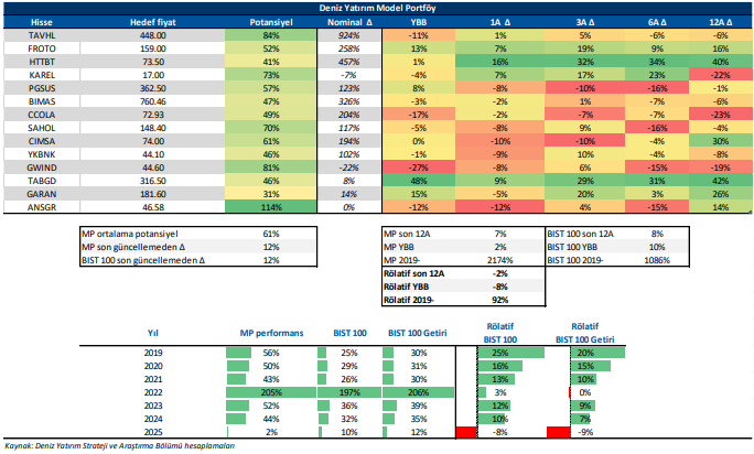 Deniz Yatırım Model Portföy, Deniz Yatırım Strateji ve Araştırma Bölümü tarafından, temel analiz kriterlerine göre hazırlanmış, orta-uzun vadeli hisse senedi tavsiye listesidir. Alınan pozisyonlar sadece uzun yönlüdür (long only). Herhangi bir rakamsal/yüzdesel getiri hedefi söz konusu değildir. Herhangi bir şirket sayısı sınırı söz konusu değildir. Herhangi bir sıklıkta/takvim dahilinde değişiklik yapma zorunluluğu söz konusu değildir. Strateji ve Araştırma Bölümü analistleri portföyü takvim yılı içerisinde piyasa koşulları izin vermez ise değiştirmeme hakkına sahiptirler. Portföy içerisinde yer alan şirketler için temel analiz açısından getiri potansiyeli kalmamış dahi olsa da (değerleme olarak) şirket markasına olan geçmiş ve gelecek dönem güveni ile liste içerisinde kalmaya devam edebilirler. Portföyde yer alan şirketler için AL tavsiyesi bulunması zorunluluğu söz konusu değildir. Bölüm analistleri, TUT ve/veya Gözden Geçiriliyor önerileri ile de liste içerisinde şirket tercihinde bulunabilirler.