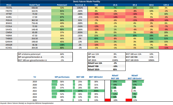 Deniz Yatırım Model Portföy, Deniz Yatırım Strateji ve Araştırma Bölümü tarafından, temel analiz kriterlerine göre hazırlanmış, orta-uzun vadeli hisse senedi tavsiye listesidir. Alınan pozisyonlar sadece uzun yönlüdür (long only). Herhangi bir rakamsal/yüzdesel getiri hedefi söz konusu değildir. Herhangi bir şirket sayısı sınırı söz konusu değildir. Herhangi bir sıklıkta/takvim dahilinde değişiklik yapma zorunluluğu söz konusu değildir. Strateji ve Araştırma Bölümü analistleri portföyü takvim yılı içerisinde piyasa koşulları izin vermez ise değiştirmeme hakkına sahiptirler. Portföy içerisinde yer alan şirketler için temel analiz açısından getiri potansiyeli kalmamış dahi olsa da (değerleme olarak) şirket markasına olan geçmiş ve gelecek dönem güveni ile liste içerisinde kalmaya devam edebilirler. Portföyde yer alan şirketler için AL tavsiyesi bulunması zorunluluğu söz konusu değildir. Bölüm analistleri, TUT ve/veya Gözden Geçiriliyor önerileri ile de liste içerisinde şirket tercihinde bulunabilirler.