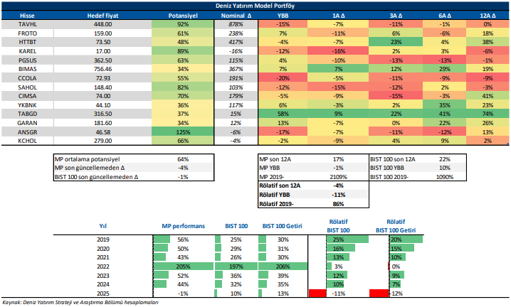Deniz Yatırım Model Portföy, Deniz Yatırım Strateji ve Araştırma Bölümü tarafından, temel analiz kriterlerine göre hazırlanmış, orta-uzun vadeli hisse senedi tavsiye listesidir. Alınan pozisyonlar sadece uzun yönlüdür (long only). Herhangi bir rakamsal/yüzdesel getiri hedefi söz konusu değildir. Herhangi bir şirket sayısı sınırı söz konusu değildir. Herhangi bir sıklıkta/takvim dahilinde değişiklik yapma zorunluluğu söz konusu değildir. Strateji ve Araştırma Bölümü analistleri portföyü takvim yılı içerisinde piyasa koşulları izin vermez ise değiştirmeme hakkına sahiptirler. Portföy içerisinde yer alan şirketler için temel analiz açısından getiri potansiyeli kalmamış dahi olsa da (değerleme olarak) şirket markasına olan geçmiş ve gelecek dönem güveni ile liste içerisinde kalmaya devam edebilirler. Portföyde yer alan şirketler için AL tavsiyesi bulunması zorunluluğu söz konusu değildir. Bölüm analistleri, TUT ve/veya Gözden Geçiriliyor önerileri ile de liste içerisinde şirket tercihinde bulunabilirler.