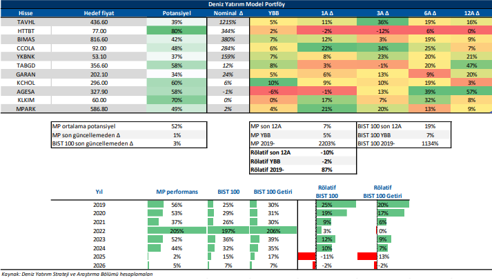 Deniz Yatırım Model Portföy, Deniz Yatırım Strateji ve Araştırma Bölümü tarafından, temel analiz kriterlerine göre hazırlanmış, orta-uzun vadeli hisse senedi tavsiye listesidir. Alınan pozisyonlar sadece uzun yönlüdür (long only). Herhangi bir rakamsal/yüzdesel getiri hedefi söz konusu değildir. Herhangi bir şirket sayısı sınırı söz konusu değildir. Herhangi bir sıklıkta/takvim dahilinde değişiklik yapma zorunluluğu söz konusu değildir. Strateji ve Araştırma Bölümü analistleri portföyü takvim yılı içerisinde piyasa koşulları izin vermez ise değiştirmeme hakkına sahiptirler. Portföy içerisinde yer alan şirketler için temel analiz açısından getiri potansiyeli kalmamış dahi olsa da (değerleme olarak) şirket markasına olan geçmiş ve gelecek dönem güveni ile liste içerisinde kalmaya devam edebilirler. Portföyde yer alan şirketler için AL tavsiyesi bulunması zorunluluğu söz konusu değildir. Bölüm analistleri, TUT ve/veya Gözden Geçiriliyor önerileri ile de liste içerisinde şirket tercihinde bulunabilirler.