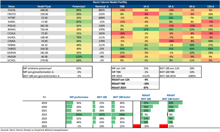 Deniz Yatırım Model Portföy, Deniz Yatırım Strateji ve Araştırma Bölümü tarafından, temel analiz kriterlerine göre hazırlanmış, orta-uzun vadeli hisse senedi tavsiye listesidir. Alınan pozisyonlar sadece uzun yönlüdür (long only). Herhangi bir rakamsal/yüzdesel getiri hedefi söz konusu değildir. Herhangi bir şirket sayısı sınırı söz konusu değildir. Herhangi bir sıklıkta/takvim dahilinde değişiklik yapma zorunluluğu söz konusu değildir. Strateji ve Araştırma Bölümü analistleri portföyü takvim yılı içerisinde piyasa koşulları izin vermez ise değiştirmeme hakkına sahiptirler. Portföy içerisinde yer alan şirketler için temel analiz açısından getiri potansiyeli kalmamış dahi olsa da (değerleme olarak) şirket markasına olan geçmiş ve gelecek dönem güveni ile liste içerisinde kalmaya devam edebilirler. Portföyde yer alan şirketler için AL tavsiyesi bulunması zorunluluğu söz konusu değildir. Bölüm analistleri, TUT ve/veya Gözden Geçiriliyor önerileri ile de liste içerisinde şirket tercihinde bulunabilirler.