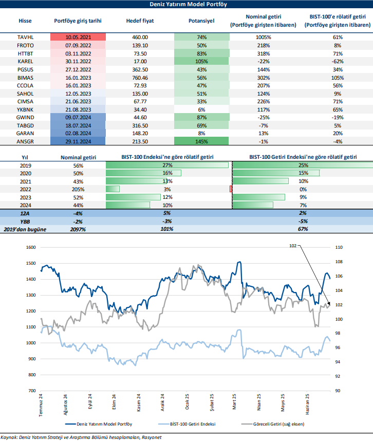 Deniz Yatırım Model Portföy, Deniz Yatırım Strateji ve Araştırma Bölümü tarafından, temel analiz kriterlerine göre hazırlanmış, orta-uzun vadeli hisse senedi tavsiye listesidir. Alınan pozisyonlar sadece uzun yönlüdür (long only). Herhangi bir rakamsal/yüzdesel getiri hedefi söz konusu değildir. Herhangi bir şirket sayısı sınırı söz konusu değildir. Herhangi bir sıklıkta/takvim dahilinde değişiklik yapma zorunluluğu söz konusu değildir. Strateji ve Araştırma Bölümü analistleri portföyü takvim yılı içerisinde piyasa koşulları izin vermez ise değiştirmeme hakkına sahiptirler. Portföy içerisinde yer alan şirketler için temel analiz açısından getiri potansiyeli kalmamış dahi olsa da (değerleme olarak) şirket markasına olan geçmiş ve gelecek dönem güveni ile liste içerisinde kalmaya devam edebilirler. Portföyde yer alan şirketler için AL tavsiyesi bulunması zorunluluğu söz konusu değildir. Bölüm analistleri, TUT ve/veya Gözden Geçiriliyor önerileri ile de liste içerisinde şirket tercihinde bulunabilirler.