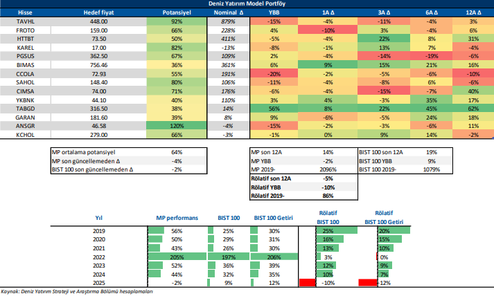 Deniz Yatırım Model Portföy, Deniz Yatırım Strateji ve Araştırma Bölümü tarafından, temel analiz kriterlerine göre hazırlanmış, orta-uzun vadeli hisse senedi tavsiye listesidir. Alınan pozisyonlar sadece uzun yönlüdür (long only). Herhangi bir rakamsal/yüzdesel getiri hedefi söz konusu değildir. Herhangi bir şirket sayısı sınırı söz konusu değildir. Herhangi bir sıklıkta/takvim dahilinde değişiklik yapma zorunluluğu söz konusu değildir. Strateji ve Araştırma Bölümü analistleri portföyü takvim yılı içerisinde piyasa koşulları izin vermez ise değiştirmeme hakkına sahiptirler. Portföy içerisinde yer alan şirketler için temel analiz açısından getiri potansiyeli kalmamış dahi olsa da (değerleme olarak) şirket markasına olan geçmiş ve gelecek dönem güveni ile liste içerisinde kalmaya devam edebilirler. Portföyde yer alan şirketler için AL tavsiyesi bulunması zorunluluğu söz konusu değildir. Bölüm analistleri, TUT ve/veya Gözden Geçiriliyor önerileri ile de liste içerisinde şirket tercihinde bulunabilirler.