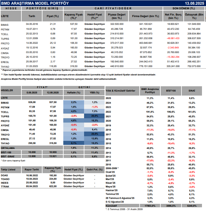 BMD Araştırma portföyünde BIMAS, PETKM, TCELL, TUPRS, FROTO, AYGAZ, CIMSA, TRGYO, THYAO ve EREGL yer almaktadır. 5-12 Ağustos 2025 döneminde BMD Araştırma Portföyü %1,9 değer kazanırken SINAİ Endeks %0,1 değer kazandı. Araştırma Portföyünde geçtiğimiz hafta en yüksek getiriyi %8,1 ile THYAO sağlarken, en düşük getiriyi -%2,8 ile TUPRS elde etmiştir. Yılbaşından bu yana BMD Araştırma Portföyü %11,3 değer kazanmış olup aynı dönemde SINAİ Endeks %6,6 değer kazanmıştır.