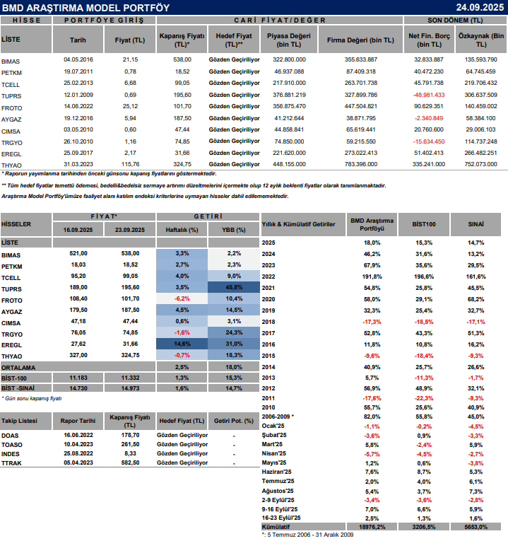 BMD Araştırma portföyünde BIMAS, PETKM, TCELL, TUPRS, FROTO, AYGAZ, CIMSA, TRGYO, THYAO ve EREGL yer almaktadır. 16-23 Eylül 2025 döneminde BMD Araştırma Portföyü %2,5 değer kazanırken SINAİ Endeks %1,6 değer kazandı. Araştırma Portföyünde geçtiğimiz hafta en yüksek getiri %14,6 ile EREGL sağlarken, en düşük getiriyi -%6,2 ile FROTO elde etmiştir. Yılbaşından bu yana BMD Araştırma Portföyü %18,0 değer kazanmış olup aynı dönemde SINAİ Endeks %14,7 değer kazanmıştır.