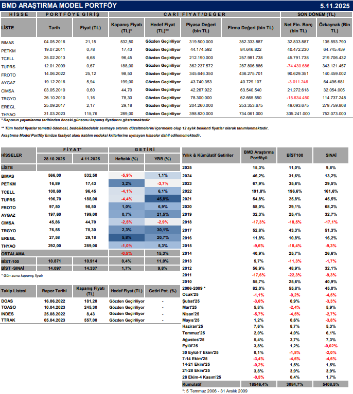 BMD Araştırma portföyünde BIMAS, PETKM, TCELL, TUPRS, FROTO, AYGAZ, CIMSA, TRGYO, THYAO ve EREGL yer almaktadır. 28 Ekim-4 Kasım 2025 döneminde BMD Araştırma Portföyü %0,5 değer kaybederken SINAİ Endeks %1,7 değer kazandı. Araştırma Portföyünde geçtiğimiz hafta en yüksek getiri %5,8 ile EREGL sağlarken, en düşük getiriyi -%5,9 ile BIMAS elde etmiştir. Yılbaşından bu yana BMD Araştırma Portföyü %15,3 değer kazanmış olup aynı dönemde SINAİ Endeks %9,8 değer kazanmıştır.