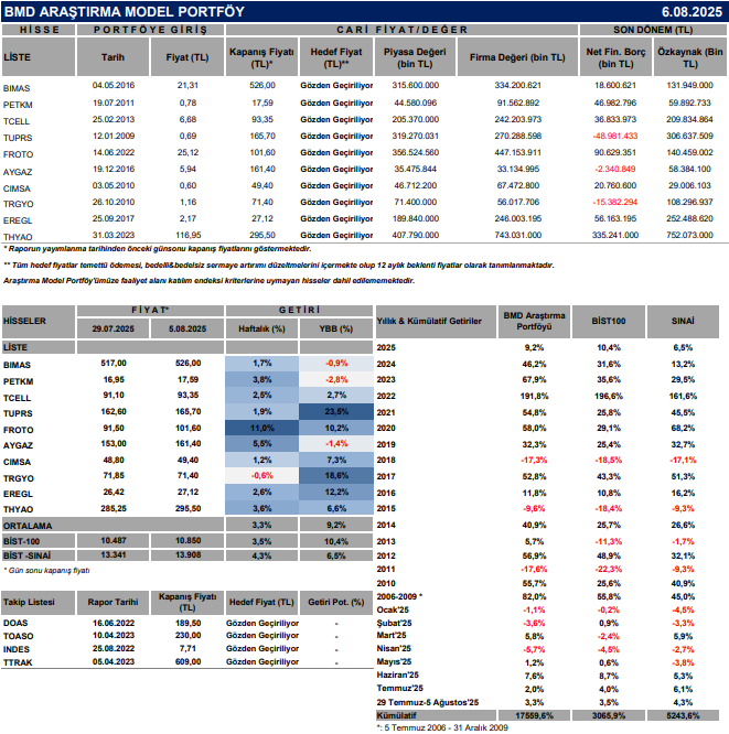 BMD Araştırma portföyünde BIMAS, PETKM, TCELL, TUPRS, FROTO, AYGAZ, CIMSA, TRGYO, THYAO ve EREGL yer almaktadır. 29 Temmuz- 5 Ağustos 2025 döneminde BMD Araştırma Portföyü %3,3 değer kazanırken SINAİ Endeks %4,3 değer kazandı. Araştırma Portföyünde geçtiğimiz hafta en yüksek getiriyi %11,0 ile FROTO sağlarken, en düşük getiriyi -%0,6 ile TRGYO elde etmiştir. Yılbaşından bu yana BMD Araştırma Portföyü %9,2 değer kazanmış olup aynı dönemde SINAİ Endeks %6,5 değer kazanmıştır.