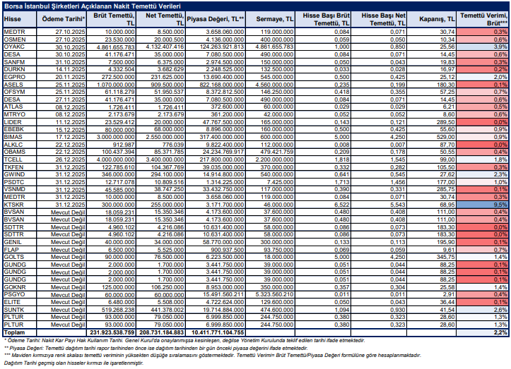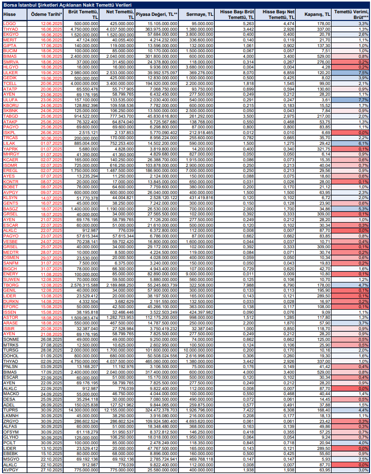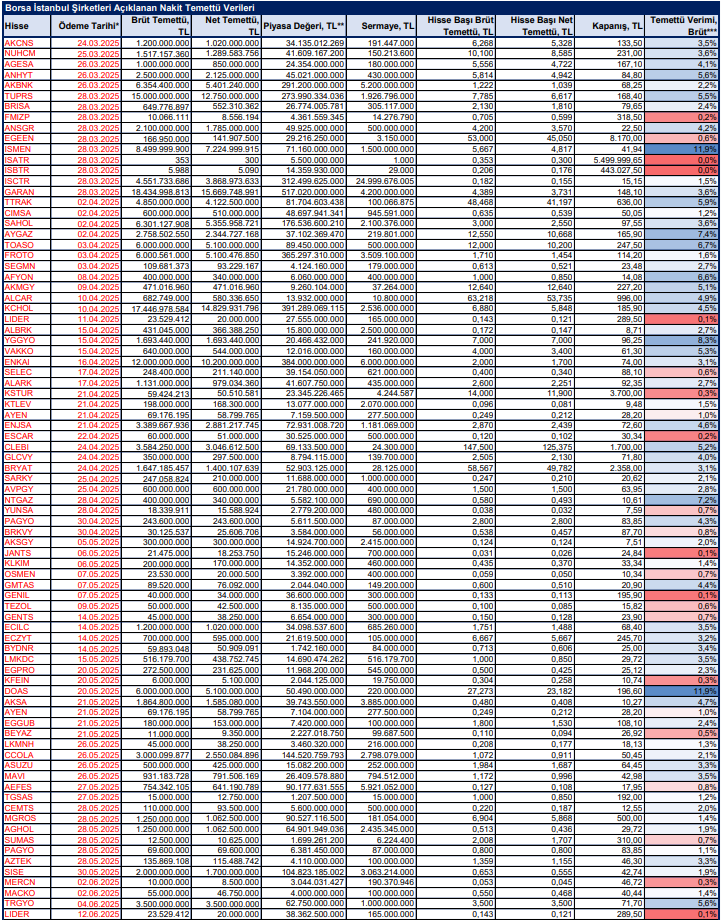 Borsa İstanbul Şirketleri Açıklanan Nakit Temettü Verileri