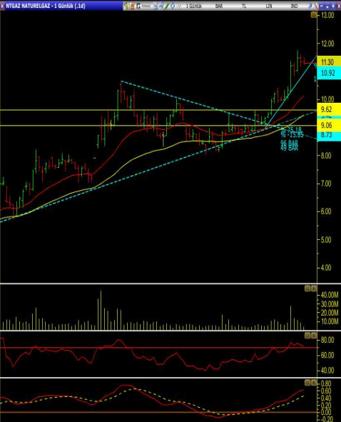 • Yükselen trend ile düşen direnç arasında sıkışan hisse, alım baskısının artması ile düşen direnci aşarak 11.75 ’e kadar yükseliyor.
