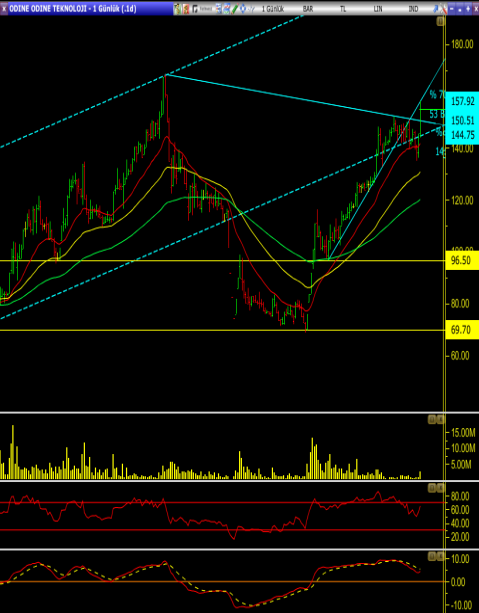 • Hisse düşüş trendinden çıktıktan sonra 96,50 desteği üzerinde taban oluşturmuş. Oradan başlayarak yükseliş trendi ile fiyat 150 TL bandına gelmiş durumda.