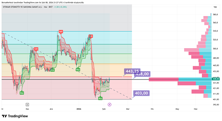 Hacim profilinde görülen dağılım, 440-450 TL bandında yoğun işlem hacminin olduğunu gösteriyor. Teknik göstergeler ve fiyat hareketleri birlikte değerlendirildiğinde, Otokar hissesinin kısa vadede bu dar bantta dalgalı seyredebileceği seziliyor.