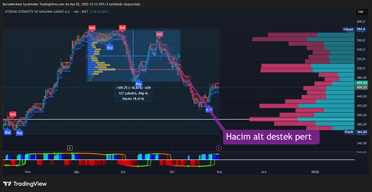 OTKAR hissesi 459,5 TL seviyesinden işlem görürken teknik analiz “Sat” sinyali veriyor. RSI 45 ile nötr bölgede ancak momentum göstergeleri olumsuz.