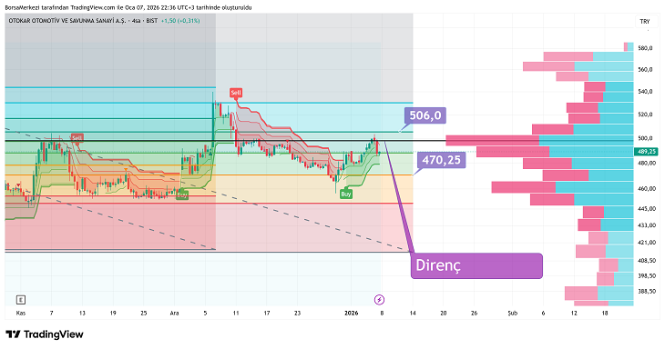 489,25’teki mevcut pozisyon kritik önemde: bu destek tutarsa 506-510 direnç bölgesine doğru yeni bir test görebiliriz, ancak altına kırılım durumunda hızla mor seviyenin işaretlendiği 470 bölgesine gidilebilir.