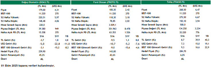 Eylül ayında güçlü pazar payı kazanımı, Audi, Cupra & VW markalarının binek araç satışlarındaki kuvvetli seyir ve hafif ticari araç satışlarındaki artışın katkısıyla Doğuş Otomotiv’in Eylül ayı performansını pozitif olarak değerlendiriyoruz. Ford Otosan tarafında binek araç satışlarındaki yükselişe rağmen hafif ticari araç satışlarındaki yatay seyir ve Eylül ayındaki pazar payı kaybına bağlı olarak Eylül ayı rakamları açısından nötr olduğunu düşünüyoruz. Tofaş tarafında ise binek araç satışlarındaki kuvvetli performansa paralel Scudo (K0) modelinin hafif ticari araç satışlarına katkısı ve Stellantis Otomotiv paylarının devrinin olumlu etkisi ile toplam satışlarda gözlemlenen artışla birlikte Eylül ayı rakamlarının Tofaş açısından etkisinin pozitif olabileceğini düşünüyoruz. 2025 yılı için yüksek faiz ortamının gevşeyeceğini ve araç talebi üzerinde daraltıcı etkisinin hafifleyebileceğini düşünüyor; sektöre giren yeni yabancı oyuncuların ise rekabet baskısı oluşturmaya devam edebileceğini de ekliyoruz (Ford Otosan için Nötr, Tofaş ve Doğuş Otomotiv için pozitif).
