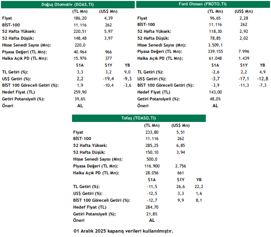 Pazar payları açısından ise Kasım 2025’te Doğuş Otomotiv’in pazar payı geçen yıla yatay seyrederek %16,1 olarak gerçekleşmiş olup Ford Otosan’ın pazar payı yıllık 0.7 yp daralma göstererek %8 olarak gerçekleşmiştir. Tofaş’ın Pazar payı ise Kasım 2025’te yıllık 4.3 yp düşüş göstererek geçen senenin aynı dönemindeki %11,3’ten %7,1’e gerilemiştir. Bununla birlikte; Stellantis Otomotiv altındaki markaların Pazar payı Kasım 2025’te 0.1 yp artış göstererek %17,6 seviyesine ulaşırken Tofaş+Stellantis Pazar payı ise 4.2 yp düşüş göstererek toplamda %24,6 seviyesinde gerçekleşmiştir. Ocak – Kasım 2025 döneminde ise Doğuş Otomotiv’in pazar payı geçen yıla göre hafif artış göstererek %14,9 olarak gerçekleşmiş olup Ford Otosan’ın pazar payı hafif düşüş göstererek %7,7 seviyesinde gerçekleşmiştir. Tofaş’ın Pazar payı ise Ocak – Kasım 2025 döneminde yıllık 2.8 yp düşüş göstererek geçen senenin aynı dönemindeki %11,9’dan %9,1’e gerilerken Stellantis Otomotiv markaları ile birlikte toplam Pazar payı 1.6 yp düşüş göstererek %26,3’e gerilemiştir.