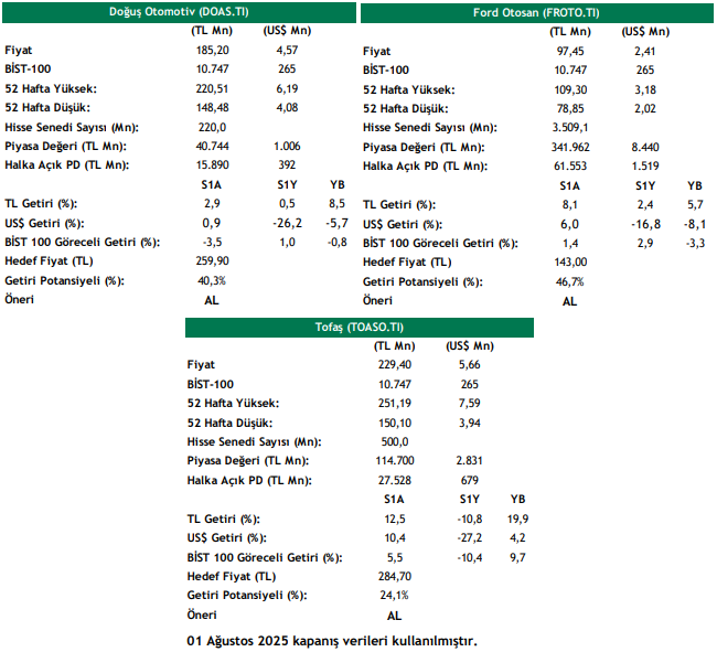 Tofaş’ın (TOASO) binek araç satışları, Temmuz 2024’teki (aylık) 7.050 adetten Temmuz 2025’teki 7.333 adete yükselirken yıllık %4,0’lük artış göstermiştir. Fiat markası (alt-orta segment) altında yapılan binek araç satışları ise yıllık %2,4 oranında artış göstererek 6.869 adet olarak gerçekleşmiştir. Tofaş’ın Temmuz ayındaki hafif ticari araç satışlarında ise daralma yaşanmış olup Şirket’in hafif ticari araç satışları yıllık %24,3 oranında azalarak 3.338 adet olarak gerçekleşmiştir (Temmuz 2024: 4.409 adet). Ocak – Temmuz 2025 döneminde ise Tofaş’ın binek araç perakende satışları yıllık %18,1 düşüş göstererek geçen senenin aynı dönemindeki 52.847 adetten 43.259 adede gerilerken Hafif Ticari Araç perakende satışları ise yıllık %31,3’lük düşüşle geçen senenin Ocak – Temmuz dönemindeki 31.899 adetten 21.914 adete gerilemiştir. Tofaş, 2025’te yurtiçi perakende pazarının 1.1mn-1.2mn adet bandında olmasını, Tofaş markalı yurt içi araç satışının ise 300-330bin adet seviyesinde olmasını beklemektedir.
