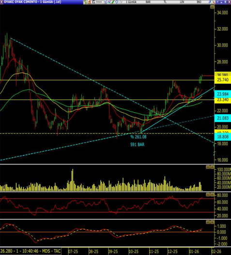 MACD ise sıfır çizgisi üzerinde pozitif eğimini koruyor. Özetle hisse 25.74 üzerinde kalıcılık sağlarsa yukarı yönlü hareketin devamı gelebilir, geri çekilmelerde ise oluşan gap boşluğuna dikkat edilmeli, destekler takip edilmelidir.