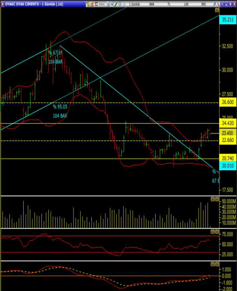 • 22.66 – 24.42 bandı arasında tutunmaya çalışan hissede negatif hareket görülüyor.