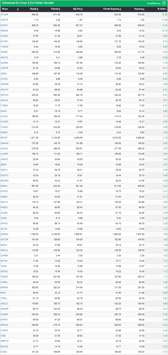 Hisse senedinin seçilen baza göre bağıl getirisinin gösterildiği tablodur. “Pahalı hisseler” tablosunda seçilen baza göre bağıl getirisi pozitif olan hisseler görüntülenir. Baz getiriye göre ucuz ve pahalı hisselerin listelenmesi, hem endeks bazında hem de sektör bazında hızlı hareket eden yada yavaş hareket hisseleri görebilmenizi sağlar.