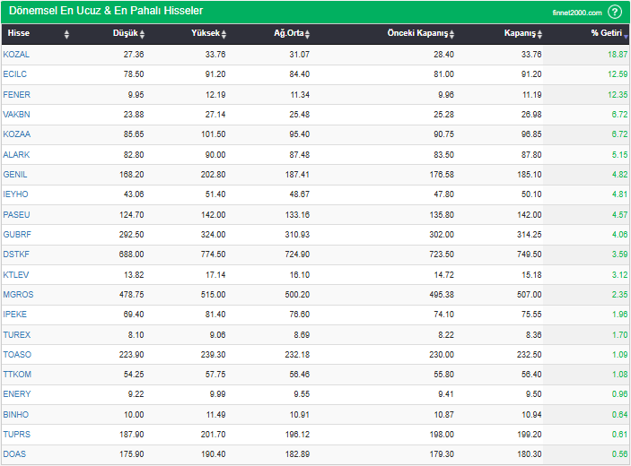 Hisse senedinin seçilen baza göre bağıl getirisinin gösterildiği tablodur. “Pahalı hisseler” tablosunda seçilen baza göre bağıl getirisi pozitif olan hisseler görüntülenir. Baz getiriye göre ucuz ve pahalı hisselerin listelenmesi, hem endeks bazında hem de sektör bazında hızlı hareket eden yada yavaş hareket hisseleri görebilmenizi sağlar.