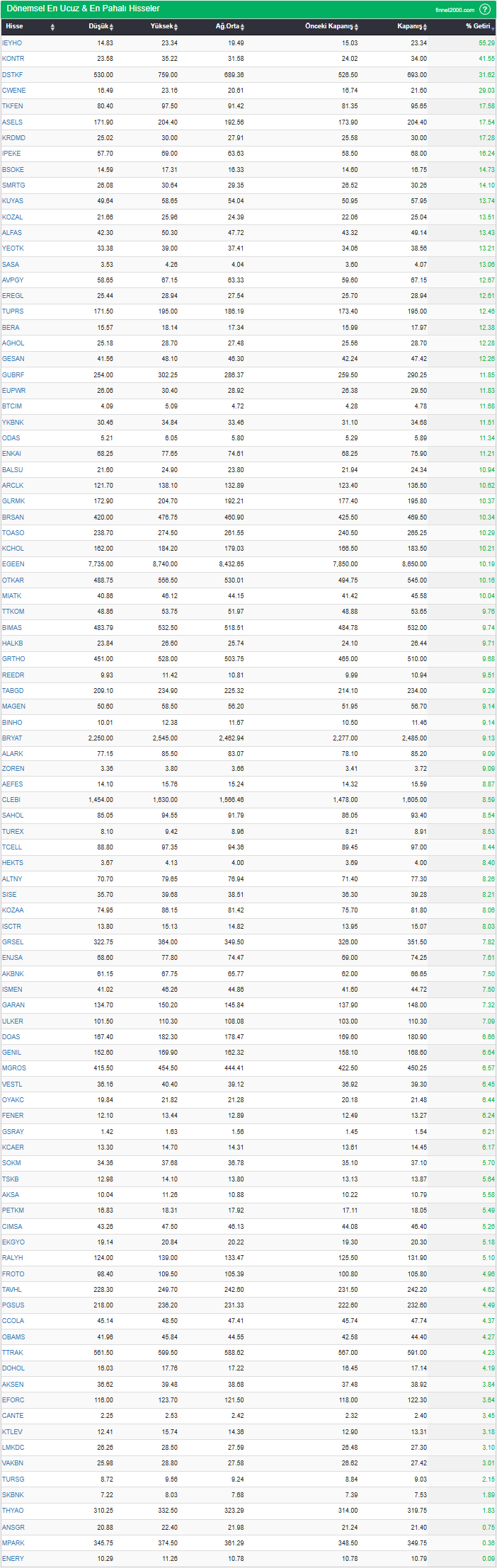 Hisse senedinin seçilen baza göre bağıl getirisinin gösterildiği tablodur. “Pahalı hisseler” tablosunda seçilen baza göre bağıl getirisi pozitif olan hisseler görüntülenir. Baz getiriye göre ucuz ve pahalı hisselerin listelenmesi, hem endeks bazında hem de sektör bazında hızlı hareket eden yada yavaş hareket hisseleri görebilmenizi sağlar.
