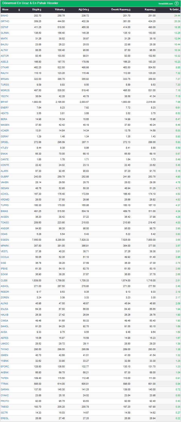 Hisse senedinin seçilen baza göre bağıl getirisinin gösterildiği tablodur. “Pahalı hisseler” tablosunda seçilen baza göre bağıl getirisi pozitif olan hisseler görüntülenir. Baz getiriye göre ucuz ve pahalı hisselerin listelenmesi, hem endeks bazında hem de sektör bazında hızlı hareket eden yada yavaş hareket hisseleri görebilmenizi sağlar.