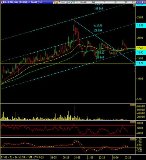 Hisse günlük grafikte uzun vadeli yükselen kanal korunmasına rağmen son dönemde trend gücü zayıflamış ve 16.40–17.40 bandında ortalamalar etrafında sıkışarak yatay görünüm almış.
