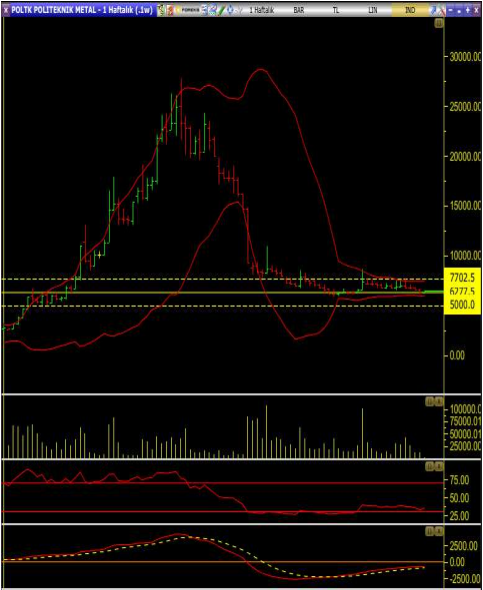 • Haftalık grafikte incelediğimiz hisse, 6277.50-7702.50 bandı arasında yatay hareketini sürdürüyor.