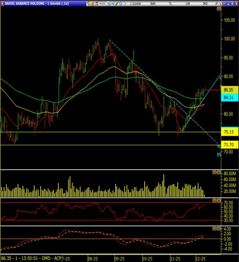 Bir süredir düşen trend eşliğinde ilerleyen hisse, 75.15 desteğinden tepki alarak yukarı yönlü hareketine başlamış.