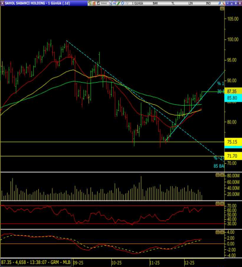 Bir süredir düşen trend eşliğinde ilerleyen hisse, 75.15 desteğinden tepki alarak yukarı yönlü hareketine başlamış.