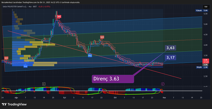SASA hisse an itibariyle 3,06 TL seviyesinde işlem görüyor ve teknik olarak “Satış” sinyali veriyor. Hareketli ortalamalar “Güçlü Satış” pozisyonunda bulunurken, osilatörler “Alış” tarafında yer alıyor.
