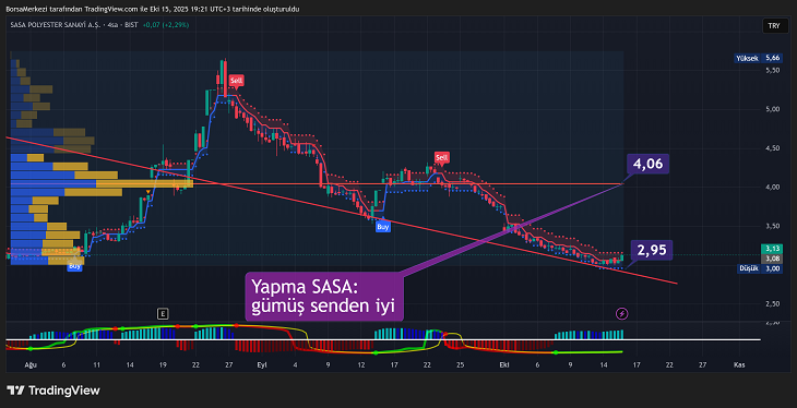 SASA hisse senedi 3,13 TRY seviyesinde işlem görüyor ve günlük bazda %1,62’lik bir artış göstermiş durumda. Teknik rating “Sat” sinyali verirken, hareketli ortalamalar “Güçlü Sat” pozisyonunda.