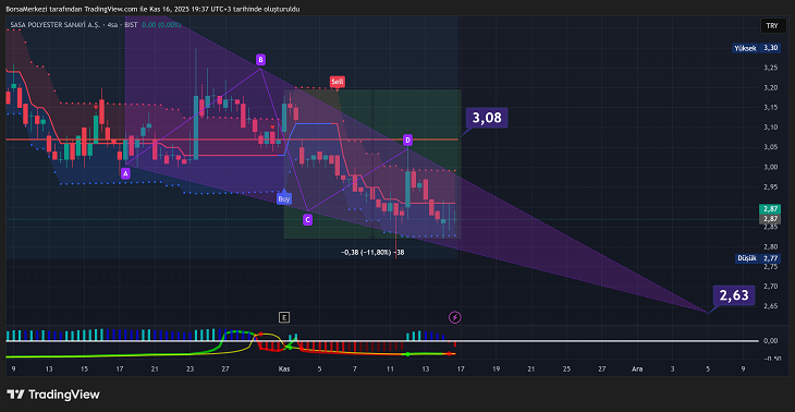 SASA hisse Teknik göstergeler hisse için güçlü bir “Sat” sinyali veriyor. Hareketli ortalamalar “Çok Sat” konumunda olup RSI 33,77 ile aşırı satım bölgesine yaklaşmış. Momentum -0,20 ve Awesome Oscillator -0,24 ile negatif bölgede seyrederken, CCI -135,72 gibi çok düşük bir değerde. Stokastik %K 26,30 ve %D 23,93 ile aşırı satım sinyali veriyor. Ichimoku Base Line 3,04 TL seviyesinde olup fiyatın üzerinde kalması direnci gösteriyor.