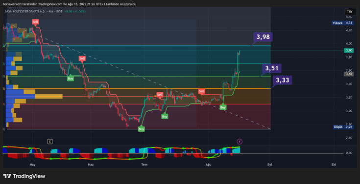 SASA, SASA Polyester, hissesi teknik olarak oldukça güçlü görünüyor. 1 günlük teknik değerlendirme ve hareketli ortalamalar “Güçlü Al” sinyalinde. RSI değeri 78 ile aşırı alım bölgesinde, momentum pozitif, CCI 265 gibi yüksek seviyede. Stokastik göstergeler de %91 / %80 ile güçlü. Kısa vadede teknik olarak yukarı yönlü baskı güçlü olsa da, RSI ve CCI yüksekliği nedeniyle kısa vadeli düzeltme ihtimali var.