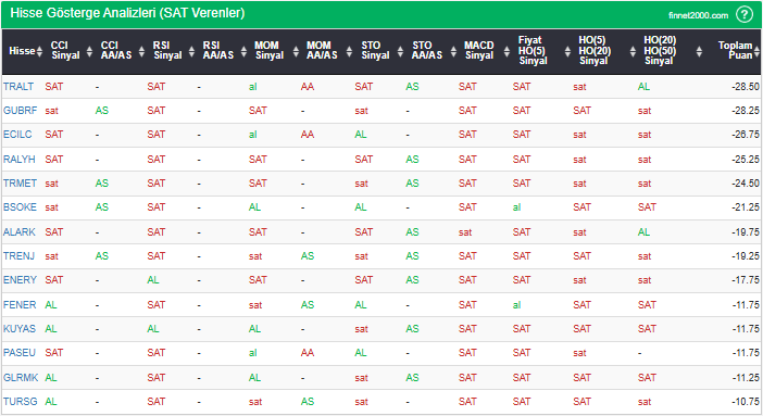 Bu çalışmada “SAT” sinyali veren hisselerin tespiti amacıyla Borsa’da işlem gören BIST 100 hisseler değerlendirmeye alınmıştır. BIST 100 üzerinde teknik analizde kullanılan 12 gösterge yöntemi ile değerleme yapılarak puanlamaya gidilerek hisseler sıralanmıştır. Ancak hisse seçiminde teknik göstergelerin tek başına kullanılması yeterli değildir. Burada ön plana çıkan hisselerin temel analizle desteklemesi ve hisseyle ilgili son haber ve bilgilerin de değerlendirilerek işlemde bulunması, daha sağlıklı sonuçlar için yararlı olacaktır.