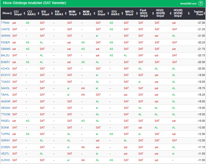 Bu çalışmada “SAT” sinyali veren hisselerin tespiti amacıyla Borsa’da işlem gören BIST 100 hisseler değerlendirmeye alınmıştır. BIST 100 üzerinde teknik analizde kullanılan 12 gösterge yöntemi ile değerleme yapılarak puanlamaya gidilerek hisseler sıralanmıştır. Ancak hisse seçiminde teknik göstergelerin tek başına kullanılması yeterli değildir. Burada ön plana çıkan hisselerin temel analizle desteklemesi ve hisseyle ilgili son haber ve bilgilerin de değerlendirilerek işlemde bulunması, daha sağlıklı sonuçlar için yararlı olacaktır.